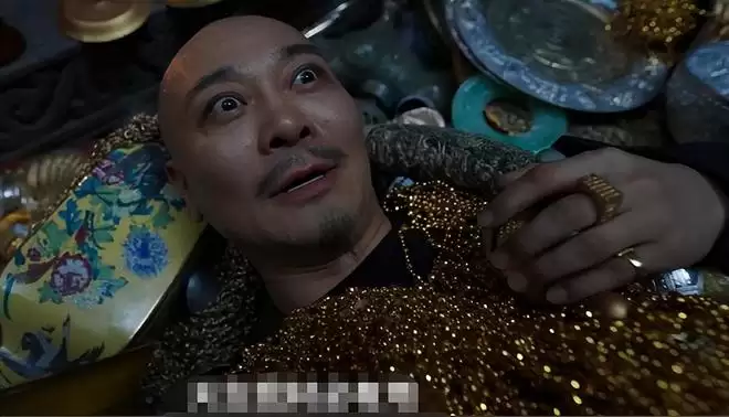 密室中面对宝藏时,他双眼通红、手指颤抖抚摸金子的模样,把人性的贪婪演到了极致。