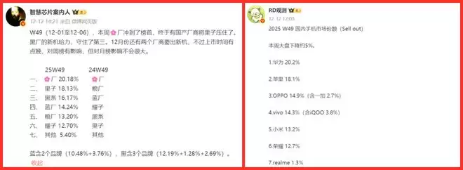 其份额在10月份凭借iPhone 17系列新品上市一度冲高至25%,但在随后的第48、49周被华为反超。