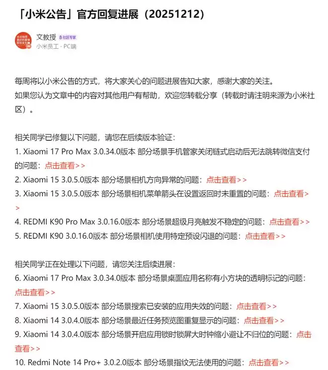 再加上自2025年8月底澎湃OS 3正式发布以来,小米对系统的优化就从未停止,这次公开的问题通报,其实是延续了其此前Beta测试阶段的迭代策略。