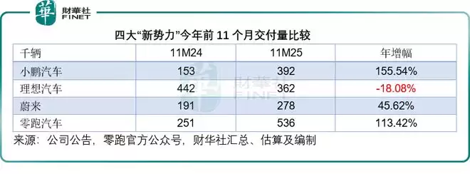 若以交付量增速论英雄,今年的格局出现了戏剧性扭转。小鹏汽车(09868.HK)一马当先,前11个月累计交付39.19万辆,同比激增155.54%,增速在四家中拔得头筹。其8月焕新上市的P7车型及持续迭代的G6、G9系列,提供了强劲推力。