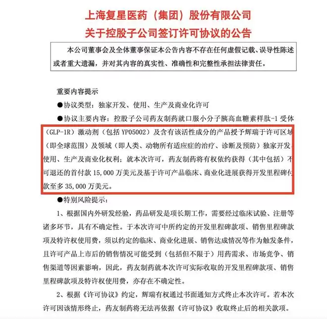 12月9日,辉瑞与复星医药旗下核心子公司——药友制药正式签署协议,以高达20.85亿美元的总交易额,获得后者自主研发的口服小分子GLP-1受体激动剂YP05002项目的全球独家权利。这笔交易创下中国创新药出海早期阶段交易金额的纪录。