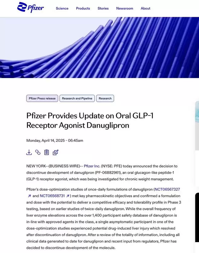 到了2025年4月14日,辉瑞再度披露临床数据:尽管新剂型达到了关键的药代动力学目标,但一名无症状受试者出现了潜在的药物诱导性肝损伤,迫使公司在审查全部临床数据及监管机构意见后,最终决定彻底终止Danuglipron的开发。