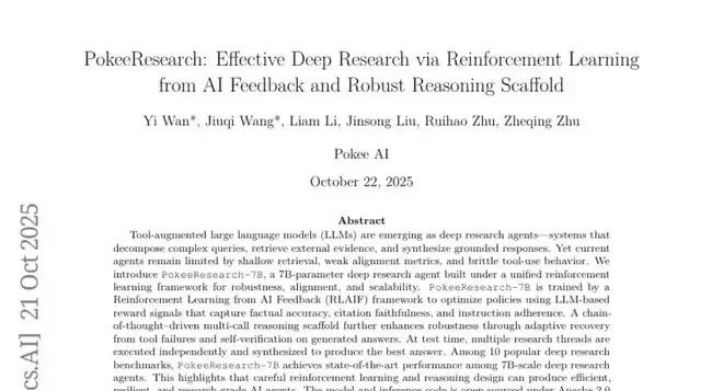 Pokee AI的研究团队正是在这样的设想下,开发出了PokeeResearch-7B这个"超级搜索助手"。与那些需要庞大计算资源的大型AI模型不同,这个助手只有70亿个参数,可以说是一个相对"轻量级"的模型,但它的研究能力却异常强大。