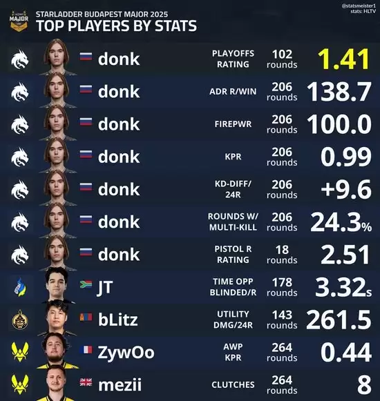 布达佩斯Major数据之最:Donk七项数据霸榜