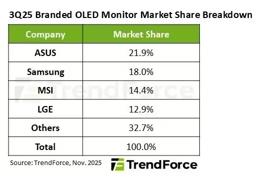 本季度市场头部品牌的竞争格局出现了显著变化。华硕以21.9%的市场份额成功超越三星,首次跃居全球首位。其成功得益于完善的产品布局,涵盖了备受玩家追捧的ROG高端电竞系列、面向专业创作者的ProArt系列,以及便携式与折叠双屏等创新产品线,实现了市场份额与品牌口碑的双重丰收。若无意外,华硕将在2025年全年首度摘得OLED显示器市场的全球桂冠。
