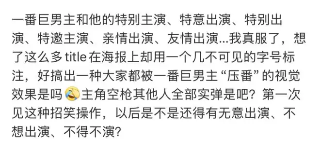 此次电影《空枪》海报的演员头衔争议,就是这一现象的极致体现。别说网友吐槽,就连笔者在整理时都差点被绕晕了。