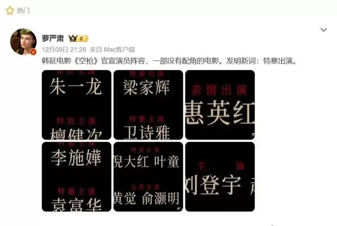 当然,被吐槽最狠的,还要属特意出演与亲情出演这两个新创头衔。其用词不仅前所未有,语义也含糊不清,由此引发集体网友玩梗:“难道梁家辉是‘顺便’来演的?惠英红是导演亲戚?”更有网友如法炮制,创造出“蓄意出演”、“试图出演”、“特意不出演”、“恶意出演”等搞笑说法,讽刺片方沉迷文字游戏,反而模糊了演员的实际定位。