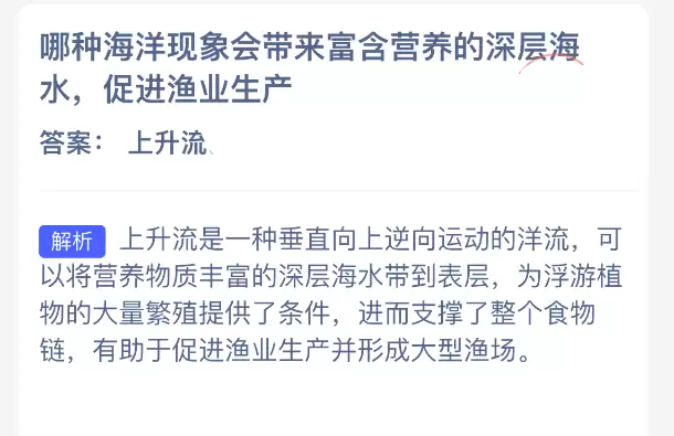哪一种海洋现象能将富含养分的深层海水带到表层,从而促进渔业生产呢?【神奇海洋】12月15日的新题目已经揭晓答案!正确答案现已公布,点击领取拼图,一同为修复海洋生态贡献力量吧!今日的正确答案是:【上升流】。上升流是一种垂直向上逆向运动的洋流,能够把营养物质丰富的深层海水带到表层。