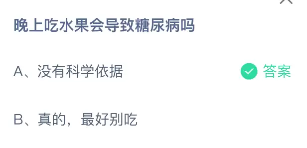 晚上吃水果真的会导致糖尿病吗?支付宝小鸡课堂开课啦!每天花一分钟答题赚饲料,喂喂小鸡就能贡献爱心,轻松又有意义!2025年12月16日蚂蚁庄园的小鸡课堂题目正确答案是【没有科学依据】,晚上吃水果容易得糖尿病的说法是没有科学依据的。