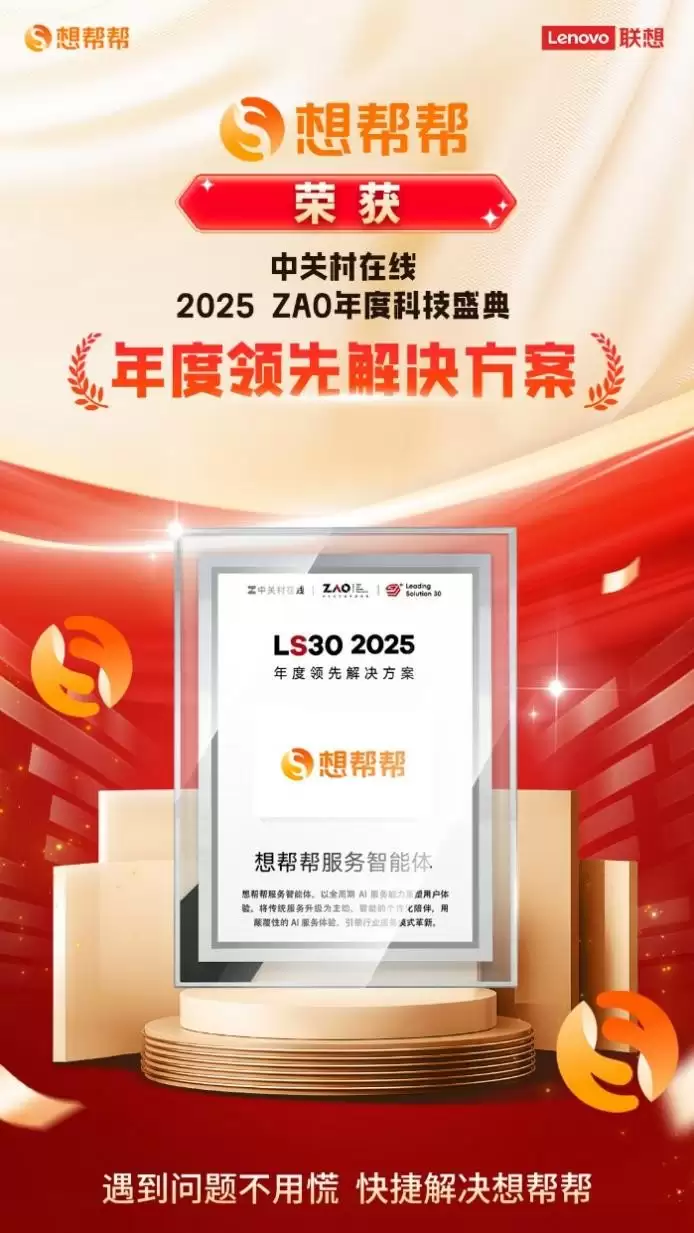 在2025年度科技盛典ZAO大会上,联想推出的“想帮帮服务智能体”一举斩获“年度领先解决方案”大奖!这项荣誉不仅代表了广大消费者与行业对想帮帮服务智能体的高度认可,也彰显了联想在AI智能服务领域持续深耕所取得的重要成果。