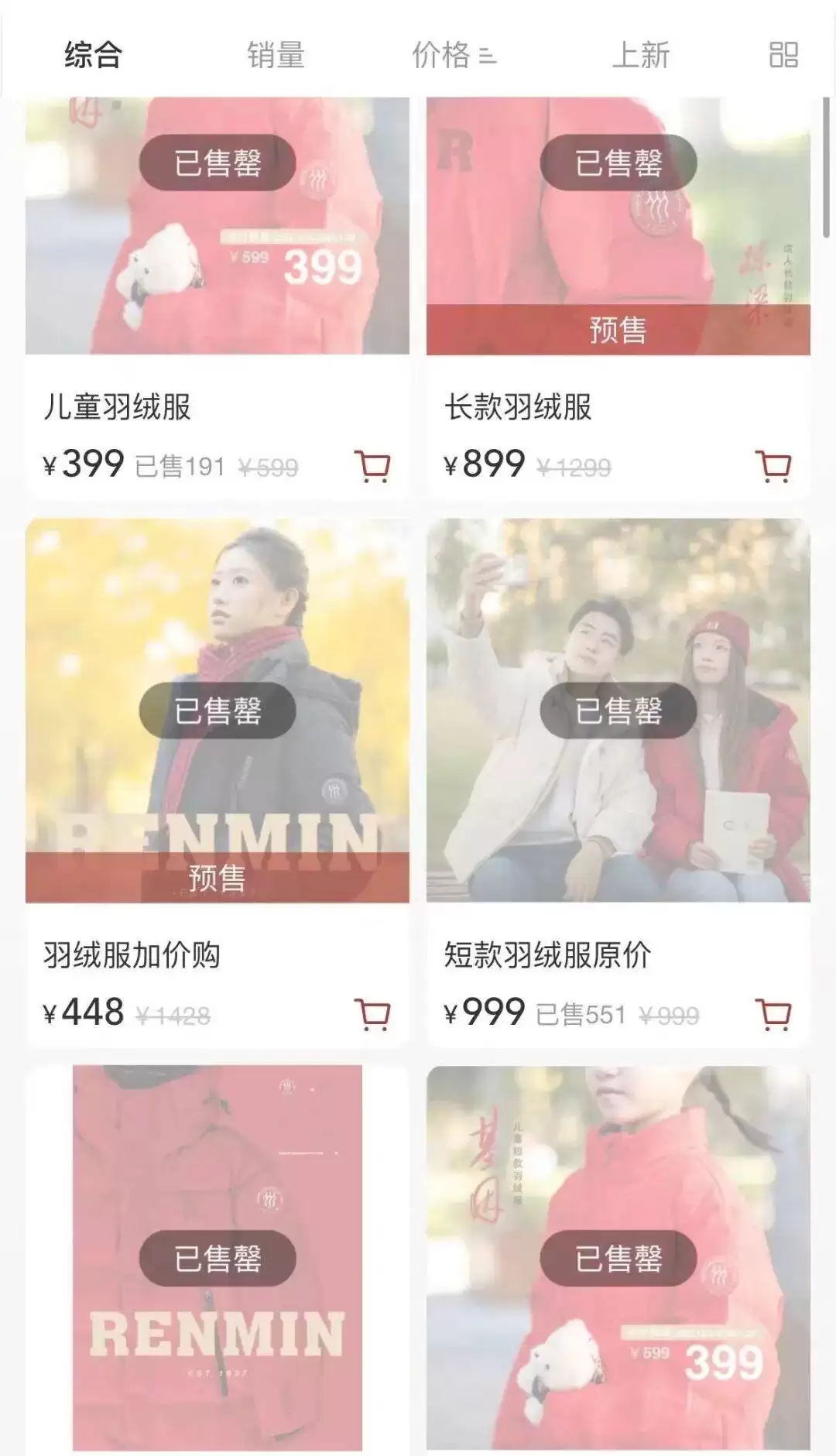 最近,一款主打“人大红”色调的高校定制羽绒服,意外成为抢手货。记者了解到,这件羽绒服通过最新的小程序“人大红创”独家发售,由于访问量瞬间激增,服务器一度被挤到瘫痪。目前,红、黑、白三款经典配色均已售罄,部分尺码甚至一“码”难求。