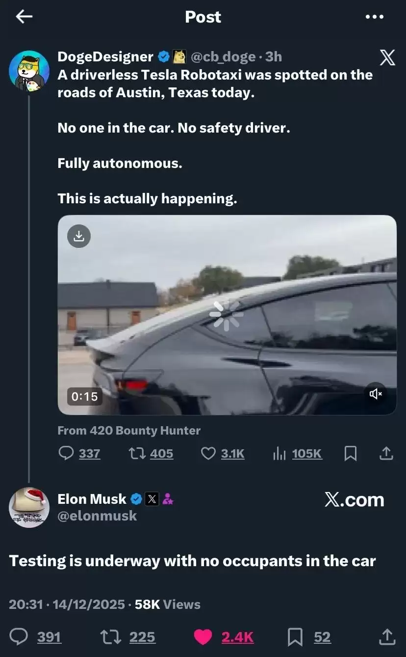 “测试正在进行中,车内没有人,”马斯克在回复发布原始视频的X用户时写道。