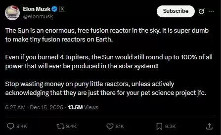 马斯克指出,太阳本身就是天空中一个巨大且免费的核聚变反应堆。它产生的能量足以满足整个太阳系的所有能源需求,相比之下,在地面建造小型核聚变装置反而是一种经济上的浪费。