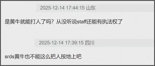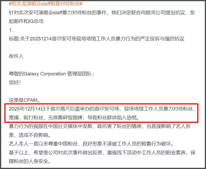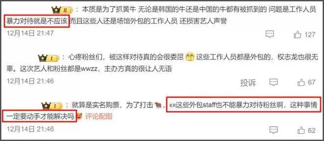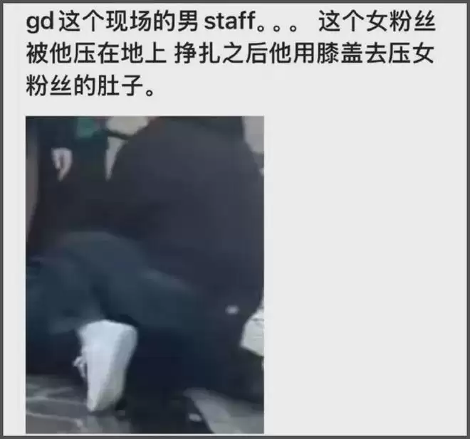 随后粉丝在权志龙演唱会上遭到工作人员暴力对待的事件也被扒出。有中粉买到手环票,疑似不符合当地实名制规定,本来禁止入场就可以,但却遭到暴力对待。不仅拽着衣服不让走,把人拽到地上也要剪断手环,还没收手机删照片,最后还要说一句“中国人都是疯子吗?”