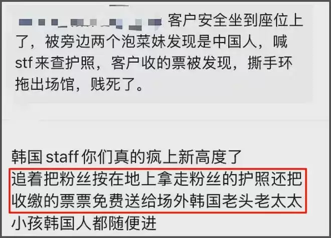 更有网友爆料,有粉丝都进场了,却遭到韩国人举报,又被撕掉手环拖出场馆;还有粉丝的护照被抢走,花高价买的票被没收之后,转手就被送给场外路人……
