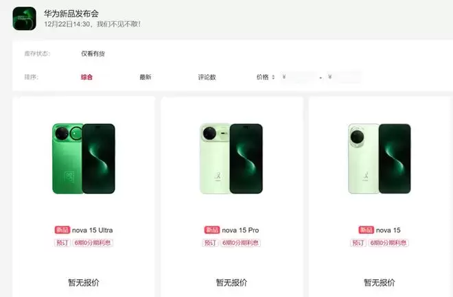 影像方面,作为nova系列的核心亮点,nova 15 Pro和nova 15 Ultra首次采用了横向大矩阵模组。前置搭载5000万像素的人像双摄,后置则由5000万像素RYYB大底主摄、1200万像素人像长焦、800万像素超广角镜头以及红枫原色镜头组成,还支持十档可变光圈。价格方面,参考上一代nova 14系列的起售价2699元,有媒体推测nova 15系列的起售价格很有可能会定在2600元左右。nova 15 Ultra配备的是麒麟9系芯片,且整体配置有所升级,价格预计会在3500元左右。目前,华为nova 15系列已正式登陆华为商城,已开启预订。(新浪科技、小雷哔哔)