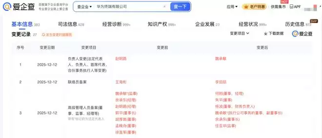 爱企查App显示,近日,华为终端有限公司发生工商变更,郭平卸任董事长,由余承东接任,孟晚舟、徐直军等卸任董事,同时,多位高管发生变更。