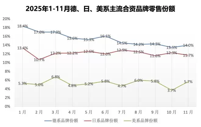 昔日的市场领导者德系与日系品牌,在2025年遭遇了份额的普遍失守。根据乘联会数据,德系品牌的月度零售份额从年初的18.4%一路震荡下滑至年末的14%左右,同比下跌成为“月度标配”;日系品牌也长期在11%-13%的低位徘徊,早已不复当年之勇。这背后,是它们赖以成名的燃油车基本盘被持续侵蚀,而电动化转型又未能提供有效增量。大众ID.系列、丰田bZ系列等电动车型的市场声量,远未能填补燃油车份额流失留下的巨大空洞。