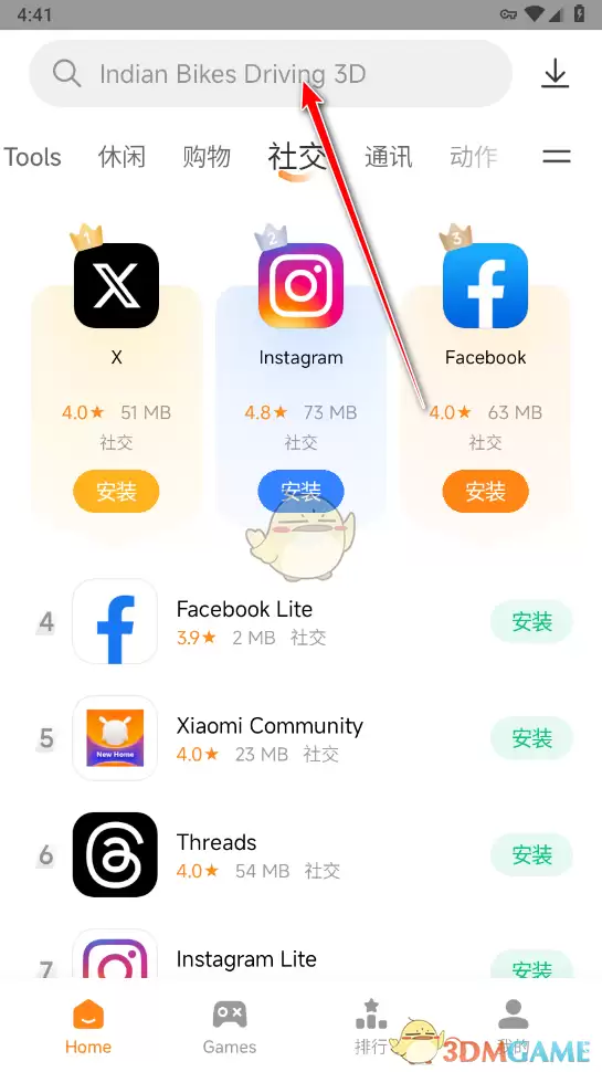 使用小米GetApps,可先打开应用,通过搜索框输入名称查找想下载的应用或游戏,在结果页点击“install”下载;也可利用分类浏览或排行榜单发现热门内容;进入“me”页面可进行设