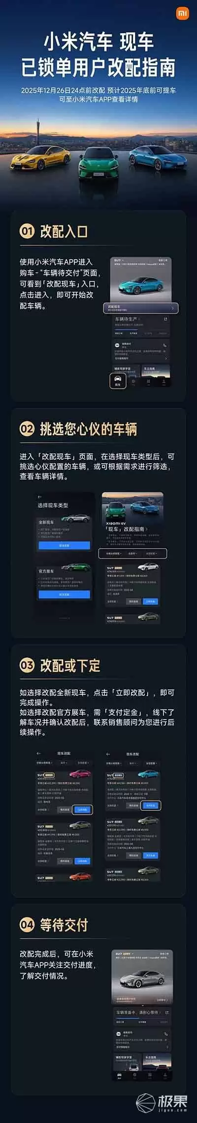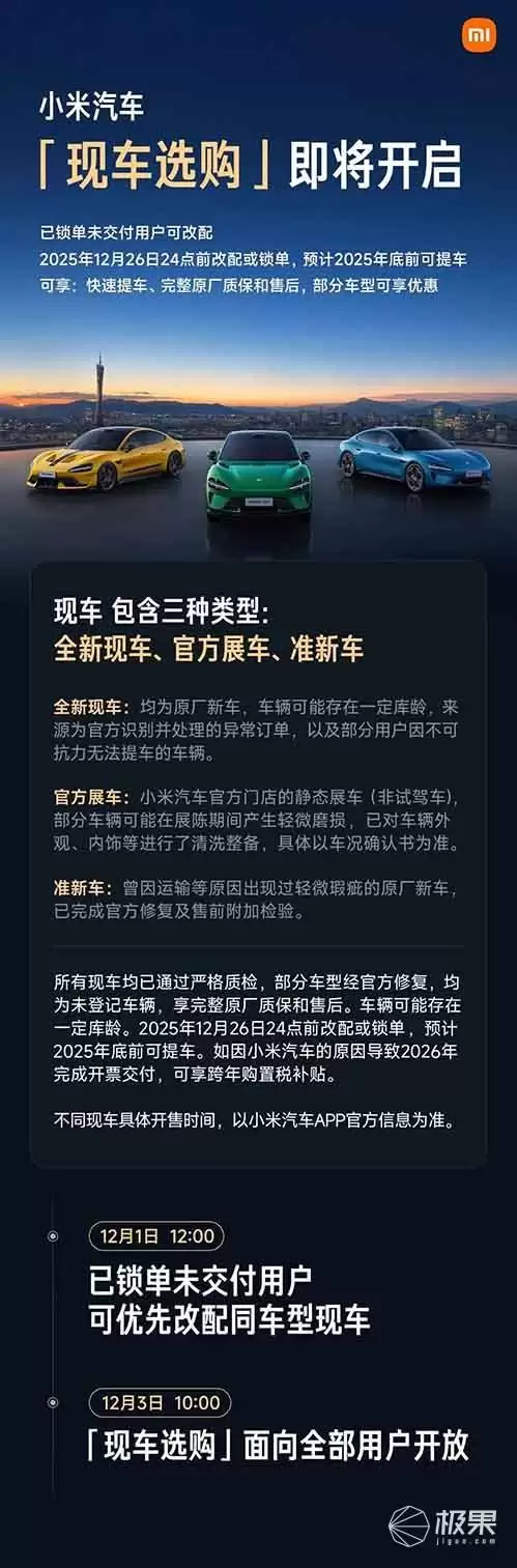 根据小米汽车公布的选购规则,从12月1日中午12点起,已锁定订单但尚未交付的用户,可以优先选择更换为同款车型的现车。而从12月3日上午10点开始,所有用户均可通过小米汽车最新版应用程序参与现车选购。对于在12月26日24点前完成订单锁定的用户,预计可在2025年12月31日前完成提车手续。若因小米方面的原因导致交付延迟至2026年,用户将获得跨年购车置税补贴作为补偿。