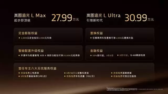 新能源豪华轿车市场迎来新的破局者。名为岚图追光L的车型以“破晓”之名登场,向传统市场格局发起有力冲击。此次上市的追光L推出两个版本,Max版定价27.99万元,Ultra版定价30.99万元。不仅如此,首任车主还可享受总价值5.2万元的六大无忧服务权益,涵盖终身免费三电质保、五年免费基础保养等,同时还提供超高价值的3年0息金融权益,诚意满满。