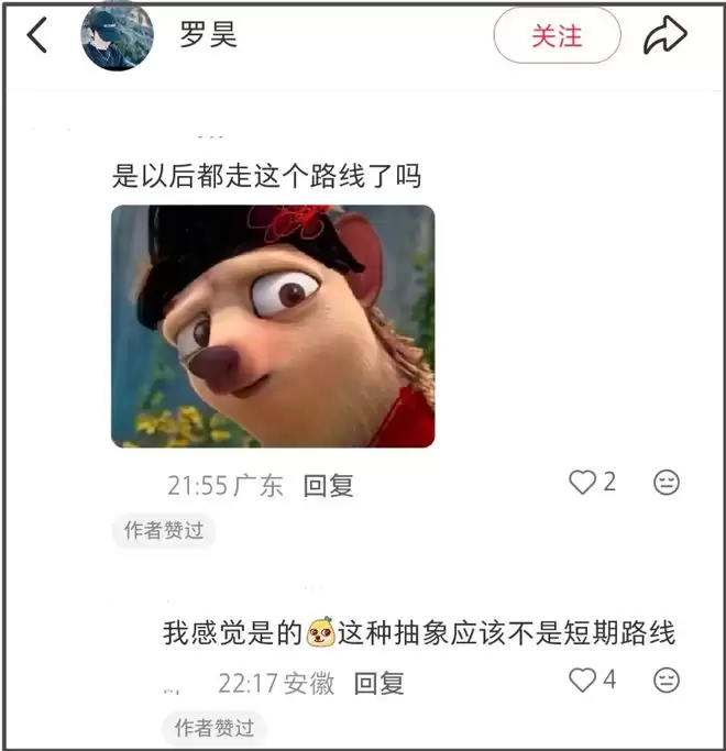 ——有人好奇罗昊是不是搞抽象,怀疑他只是短期改变风格,罗昊通过点赞的方式否认了,那就尊重罗昊的选择吧。