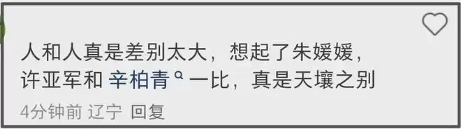 而许亚军的这般操作也让人想起了辛柏青,有对比就有伤害,虽然一个是前妻一个是老妻,但做法真的是天壤之别。也因此有网友表示滤镜碎光,认为他的行为实在太下头。