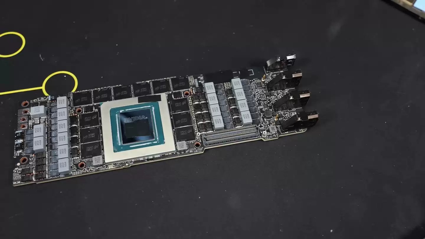 在第一步拆卸下显卡的“背板”后,可以清晰看到TITAN RTX Ada原型的独特设计:它的PCB板并非垂直插装,而是“平躺”在整个显卡模组的底部,与PCIe插槽保持垂直。这意味着在标准直插模式下,这块PCB实际上是与主板平行的。