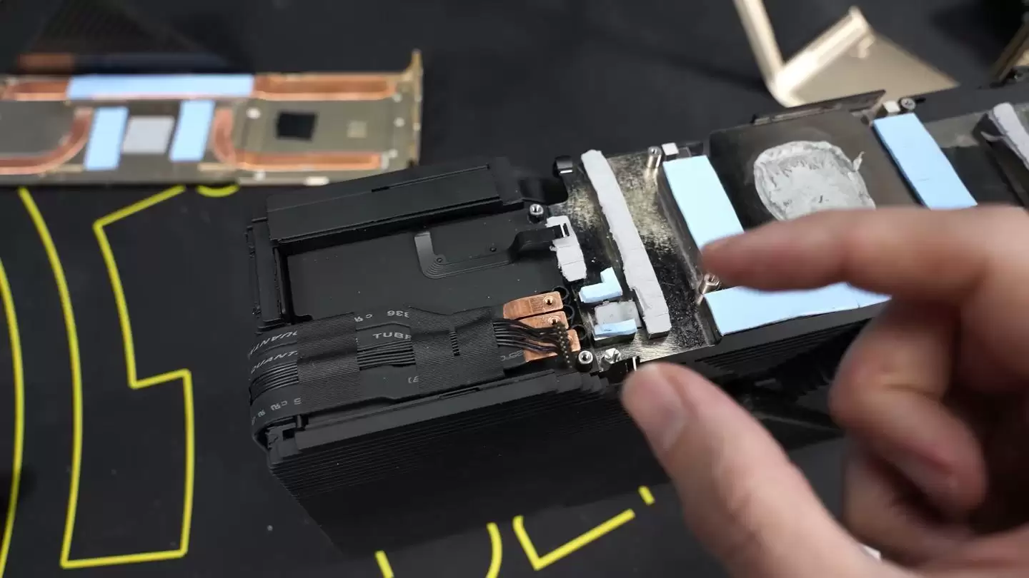 这块显卡的“背板”内嵌了三根热管,用以改善PCB背面电子元件的散热效率。这种设计在布局类似的GeForce RTX 4090 Ti原型卡上并未出现。