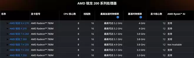 采用Zen 4架构的锐龙200系列马甲处理器则主要用于入门级和主流价位的轻薄本,该系列处理器与锐龙8000系列处理器一脉相承,最高规格8核16线程,比如锐龙7 H 260/锐龙9 H 270,同时8核处理器也是锐龙200系列轻薄本产品中的主要CPU型号,虽然不是最新平台的硬件,但应对日常应用还是轻松愉快。