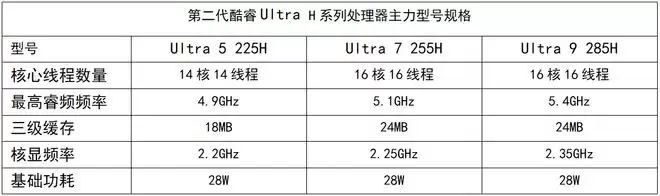 2025年,英特尔阵营轻薄本的全新硬件平台为第二代酷睿Ultra H处理器,如果说第一代酷睿Ultra H处理器是高性能与低能耗的均衡之作,那么第二代酷睿Ultra H就在此基础上再次进行了变革与创新:采用3nm先进制程,去掉了超线程设计,并提升了AI算力,不管是CPU性能、核显性能还是AI算力,都有大幅度的增长。规格方面,第二代酷睿Ultra H主要型号为14核14线程的Ultra 5以及16核16线程的Ultra 7,内置Arc锐炫核显,基础功耗为28W。实战性能方面,以考机85W左右的Ultra 5 225H处理器为例,其在Cinebench R23多核中能跑到18500分左右,已经达到了游戏本8核16线程H处理器的性能表现,在轻薄本上可以说是非常强力!此外,第二代酷睿Ultra移动处理器还有Ultra U系列与Ultra V系列,不过前者在国内市场非常少见,后者发布于2024年并已于当年做过盘点,这里就不再赘述。