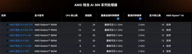 采用Zen 5+Zen 5C混合架构的锐龙AI 300系列处理器主要用于中高端价位的轻薄本上,最高规格12核24线程,常见的型号包括8核16线程的锐龙AI 7 H 350、10核20线程的锐龙AI 9 H365、12核24线程的锐龙AI 9 HX 370等。