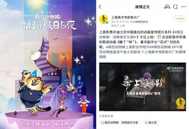 2025年6月,迪士尼中国宣布与上海美术电影制片厂达成特别合作,邀请四位中国动画导演,运用定格、水墨、二维、剪纸四种中国传统美术动画技法,创作了动画宣传短片系列《疯狂动物城:动物城日与夜》。值得注意的是,这一合作并非简单的IP授权,而是基于中国传统文化艺术的创造性转化。