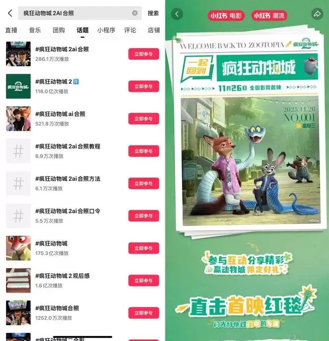 在小红书平台,与朱迪尼克合影的相关攻略和教程广为流传。用户只需复制特定“口令”,在AI绘图工具中操作,即可得到一张跨次元合影。在这场照片狂欢中,AI工具的易用性与趣味性,显著降低了创作门槛,让电影角色以轻盈、个性化的方式融入观众的日常表达。