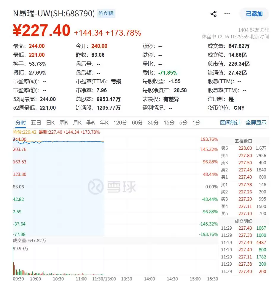 据悉,昂瑞微此次发行价格对应的发行人2024年摊薄后静态市盈率为3.93倍,低于同行业可比公司2024年静态市盈率平均值。尽管如此,上市首日,昂瑞微在资本市场掀起了不小的热潮。公司股票以240元/股的价格高开,相较83.06元的发行价,涨幅高达188.95%。截至午间休盘,昂瑞微股价稳定在227.4元/股,总涨幅173.78%,公司总市值达到226.34亿元。