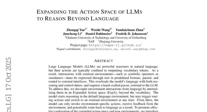 这项由瑞典哥德堡大学(Chalmers University of Technology)和哥德堡大学(University of Gothenburg)的岳忠琪(Zhongqi Yue)和弗雷德里克·约翰松(Fredrik D. Johansson)领导,与SAP公司王维石(Weishi Wang)、丹尼尔·达尔迈尔(Daniel Dahlmeier)以及浙江大学詹云大川(Yundaichuan Zhan)、李俊城(Juncheng Li)等学者合作完成的研究,发表于2025年10月的人工智能顶级会议论文集。该研究提出了一种全新的ExpA(Expanded Action)框架和EARL(ExpA Reinforcement Learning)算法,首次让大语言模型能够直接与外部环境交互,而不是仅仅依靠文本描述。有兴趣深入了解的读者可以通过论文编号arXiv:2510.07581v2查询完整论文。
