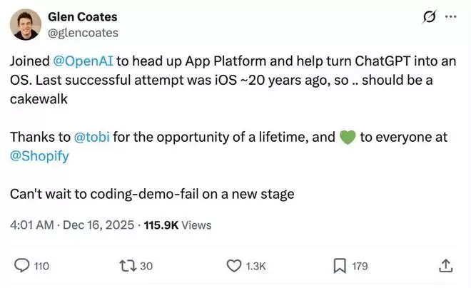Glen Coates在官宣推文中称,他将助力团队推动ChatGPT向操作系统方向转型。