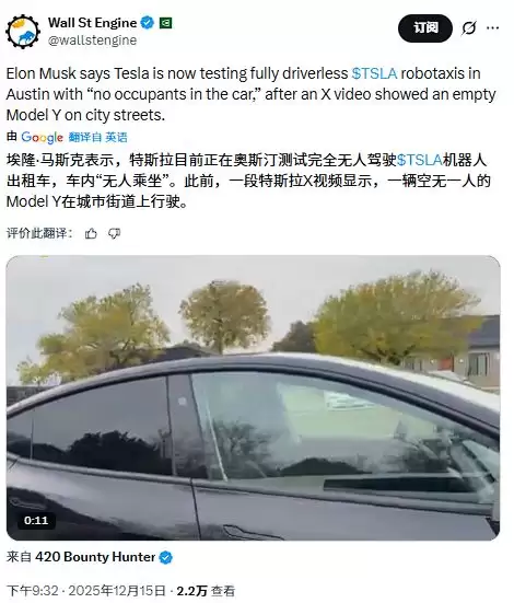 特斯拉CEO马斯克上周末确认了社交媒体上流传的视频,显示特斯拉Robotaxi在奥斯汀街道上无人驾驶运行。这与公司三季度财报电话会议上提出的年底前移除安全监督员的目标保持一致。