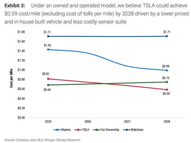 摩根士丹利分析显示,在自营模式下,特斯拉到2028年可实现每英里0.59美元的运营成本(不含过路费),显著低于Waymo的0.75美元、传统拼车服务的0.99美元,以及私家车使用成本的0.81美元。