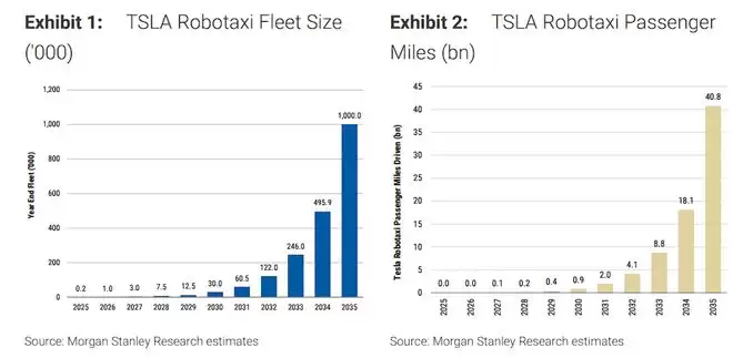根据摩根士丹利的预测模型,特斯拉Robotaxi车队规模将从2025年的200辆快速增长至2026年的1000辆,随后保持高速增长态势。到2030年,车队规模将达到3万辆,2035年最终达到100万辆的目标