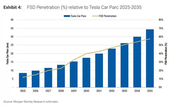 摩根士丹利认为,强大可靠的Robotaxi车队应当成为加速部署完全无监督个人FSD的明确前兆。