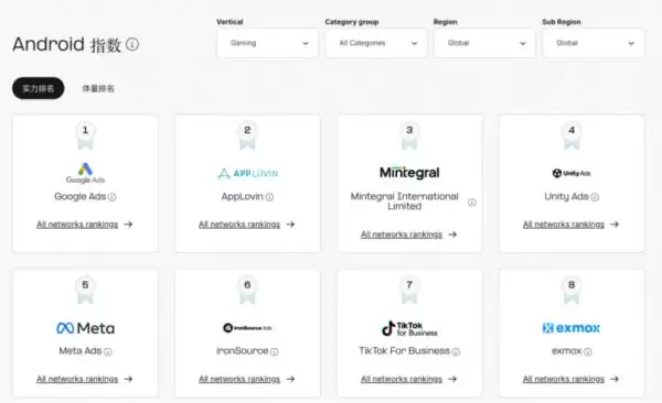 Android侧:Google断层领先,Mintegral挺进前三。Android端游戏榜单中,Google Ads依然占据绝对统治地位。AppLovin位居第二,显示出其在游戏品类中的强势地位。值得注意的是,中国出海广告平台Mintegral凭借在动作、超休闲、竞速等品类中的突出表现,强势跃升至全球综合实力榜第三名。此外, adjoe作为“新面孔”增长迅速,在榜单中占据了一席之地。