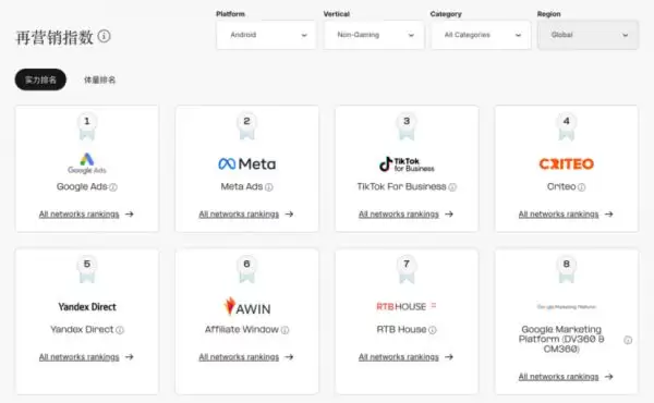 在再营销方面,2025年再营销市场持续扩张,开展再营销的应用数量与转化量均同比增长20%;Google与Meta在综合实力与体量榜中继续分列第一、第二,且占比甚至高于获客领域。此外,出现了一个令人意外的结果:欧洲平台Adikteev在Android端游戏再营销排名中击败一众巨头,登顶第一。这表明在细分领域,深耕技术的垂直平台仍有巨大的突围机会。