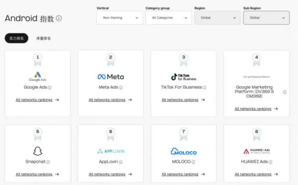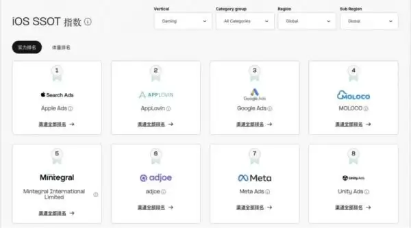 iOS侧:Apple Ads领跑,AppLovin缩小差距。Apple Ads在隐私新政后持续巩固其霸主地位,在iOS游戏综合实力榜上稳居第一。然而,AppLovin成为过去两年最大的行业亮点,凭借对行业格局变化的敏锐捕捉,其在iOS游戏榜单中排名第二,且与Apple Ads的差距正在显著缩小。Google、MOLOCO分列三四位,国产平台Mintegral表现抢眼,跻身第五。