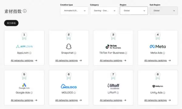 从结果来看,在游戏领域,AppLovin 在试玩试看类和动画+真人类素材上排名第一,显示出其在互动性广告上的优势。MOLOCO 在中度游戏的动画内容素材上排名第一。在非游戏领域,TikTok for Business 和 Google Ads(以 YouTube 为主)则分别在动画 + 真人混剪和UGC(用户生成内容)类素材上表现最佳。