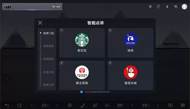 此外,还新增了“车生活”智能语音点单功能。通过语音即可直接下单瑞幸咖啡、星巴克、蜜雪冰城、霸王茶姬等饮品,并融合了车载刷脸支付与一键导航到店的功能,让消费体验更加便捷高效。