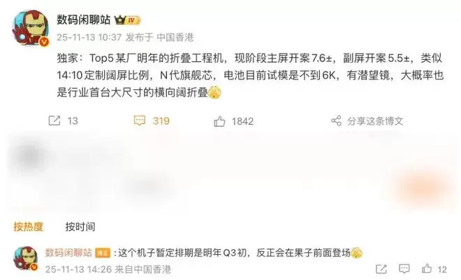 这位博主随后的另一份消息中还提到,OPPO、vivo、小米、华为、荣耀都会迭代大折叠,明年大部分还是先上常规比例,大概年中往后陆续上“阔折叠”,预计会有3台,竞对iPhone Fold。但与此同时,小折叠则大部分有停更趋势,市场热度一般。