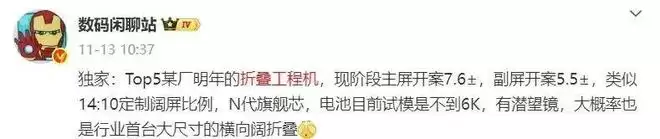 上个月的一份消息中提到,Top5某厂明年的折叠工程机,现阶段主屏开案7.6±,副屏开案5.5±,类似14:10定制阔屏比例,N代旗舰芯,电池目前试模是不到6K,有潜望镜,大概率也是行业首台大尺寸的横向阔折叠。