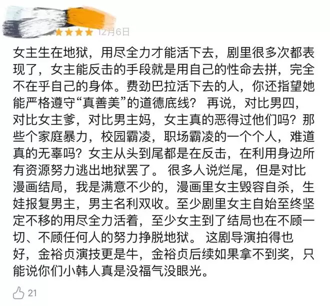 在这个意义上,《亲爱的X》的遗憾在于,它几乎用“反社会人格”的逻辑覆盖了人性中的所有可能,将人物困在了永恒的对抗与算计中。相比之下,《黑暗荣耀》中那句“等春天再死”,以及文东恩与工厂女工、被家暴大婶之间形成的微弱同盟,则保留了人性中非工具性的温暖微光。