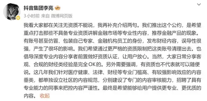 12月16日,抖音副总裁李亮在微博发文表示,平台正式推出财经行业公约,旨在重点整治那些缺乏专业资质却讲解金融市场等专业知识、同时推介金融产品的乱象。部分账号甚至假冒、伪装成专家或金融机构员工身份发布财经内容,误导性极强,造成了不良影响。我们希望透过更严格的资质限制,将此类账号清理出去。同时也倡导深度专业内容分享者提前做好资质认证,让用户更加放心。大家日常分享客观、合规的财经类经验是完全没问题的。另外需要强调,有资质也不代表可以随意发表言论。